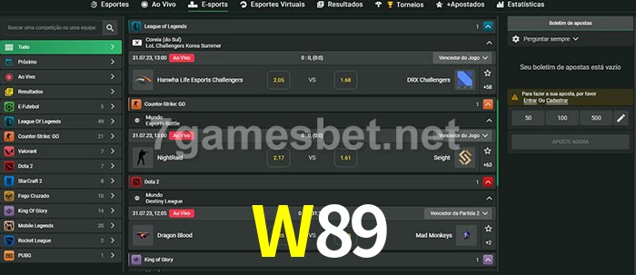 O W89 oferece uma grande seleção de opções de apostas em e-sports com probabilidades competitivas